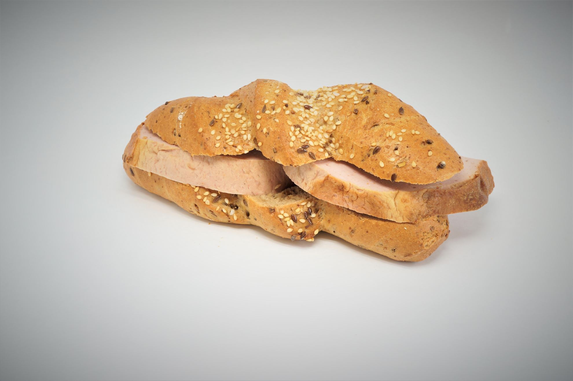 Hauseigenes Korngebäck belegt mit einer Scheibe saftigen Leberkäse.